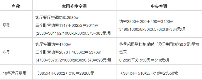 從總用電量來講,一臺中央空調(diào)其機器用電量小于每個房間裝一臺分體空調(diào)的用電量之和。以三室兩廳面積130㎡的戶型為例,按夏季運行4個月,冬季運行2個月,運行費用按每天8小時每月30天計算,估算電費如下(所有房間都開啟空調(diào)):